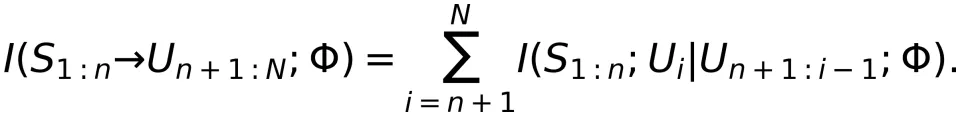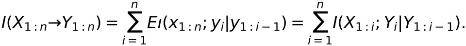 从信道容量的讨论可以看出,互信息 I (X;Y) 描述了 Ash-DMC 的输入序列和输出序列之间的统计相关性,但却无法适用于 Massey-DMC 信道。基于 Marko 在双向通信问题中的研究¹⁵,Massey 提出用定向信息来描述 Massey-DMC 的端到端统计相关性。具体来说,从输入序列 到输出序列
