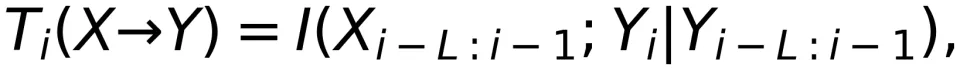 这个定义是非常普适的,但没有可操作性。为了用信息论测度来衡量两个时间序列的 Granger 因果性,物理学界提出了传递熵的概念²⁸。从序列 X_(1:n) 到序列 Y_(1:n) 的传递熵定义为