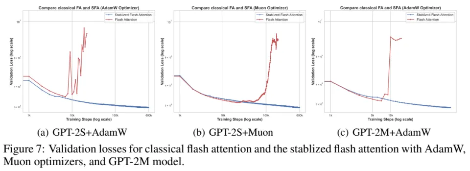 GPT-2S:使用修改后的 FlashAttention,在 AdamW 与 Muon 两种优化器下,都能稳定训练到 600K steps