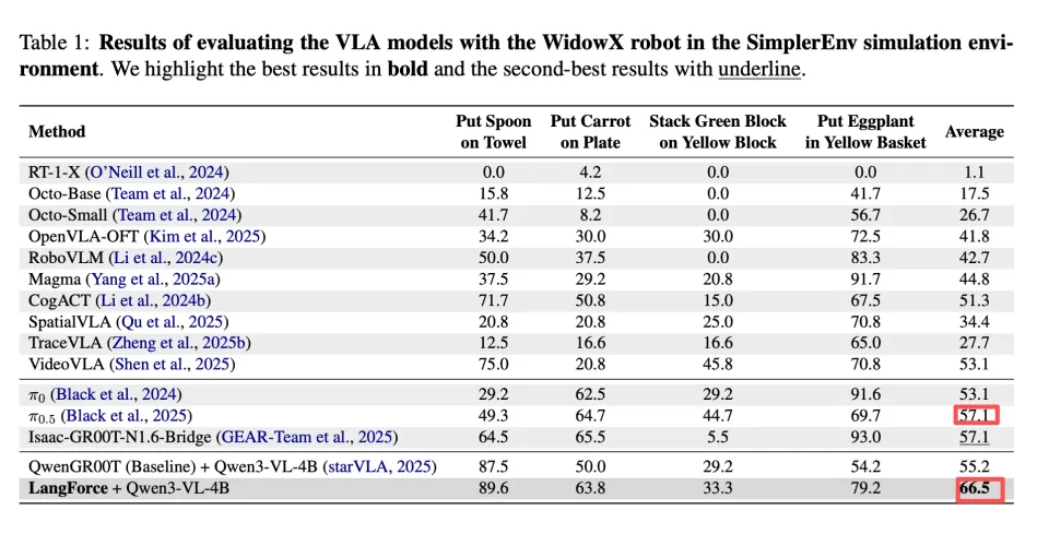 这个小小的改进带来的增益非常明显:在不使用任何机器人真机轨迹数据进行预训练的情况下,以原生 Qwen-3-VL 为主干进行微调的模型在 SimplerEnv 的四个任务上实现了 66.5% 的成功率,领先 Pi0.5 将近 10 个百分点。