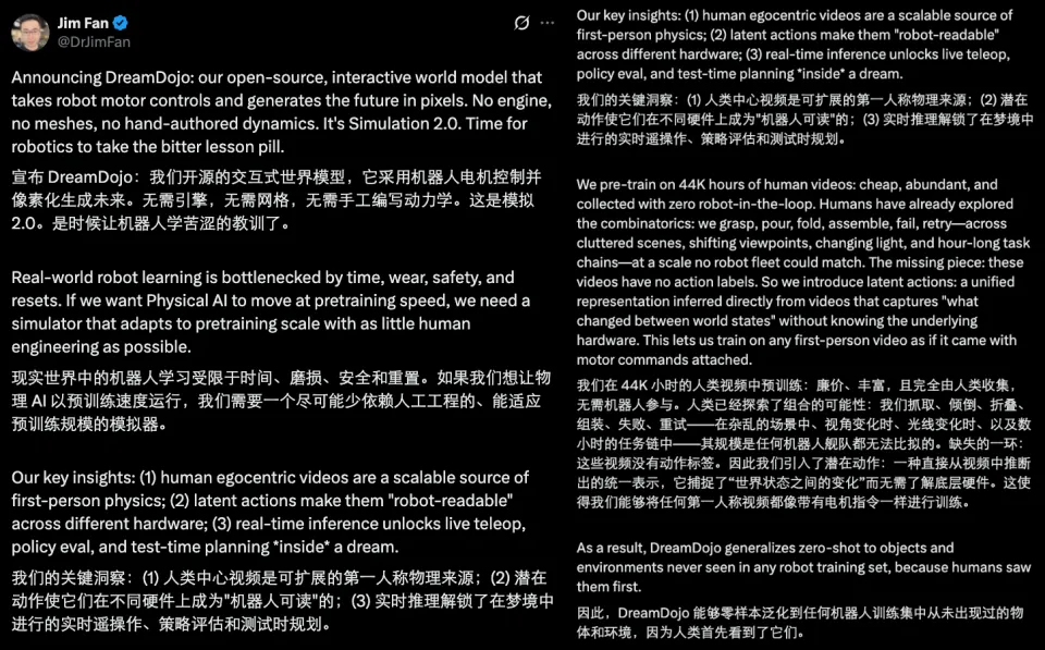 这不禁让人想起英伟达年前的另一项王炸 ——DreamDojo。那个用 4.4 万小时人类第一视角视频训练出来的模型,展现出了极强的「举一反三」能力。即使面对完全陌生的物体和环境,机器人也能像熟练工一样自如应对。原因其实很简单:人类见过它们,而模型学习了人类的视角。