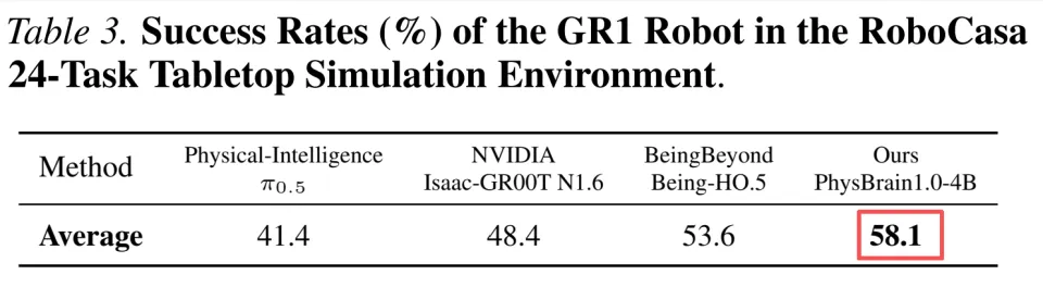 这种领先优势在其他具有挑战性的场景中得到了进一步验证。在 RoboCasa 上,PhysBrain1.0 仅使用千小时人类第一视角数据做 VLM 增强,就达到 58.1% 成功率,拿下 SOTA。这个测试强调多阶段家庭场景操作,考察的是长程规划与稳定执行能力,结果说明模型已具备真实场景落地的潜力。