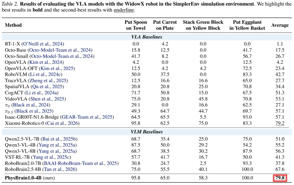 最近,深度机智在训练的新模型中融合了上述三种方法,发现新训练出的模型(即将发布的 PhysBrain1.0 )在 SimplerEnv 测试中直接跑出了 79.8% 的平均成功率,超越了行业标杆 Pi0.5 达 22.7%,也超过了之前成绩最好的 Xiaomi-Robotics-0(79.2%),达到 SOTA。