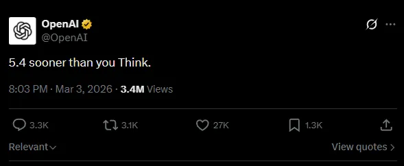 今年以来,我们已经迎来了GPT-5.1,GPT-5.2,马上5.4也要来了,更新节奏甚至接近了一个月一次。