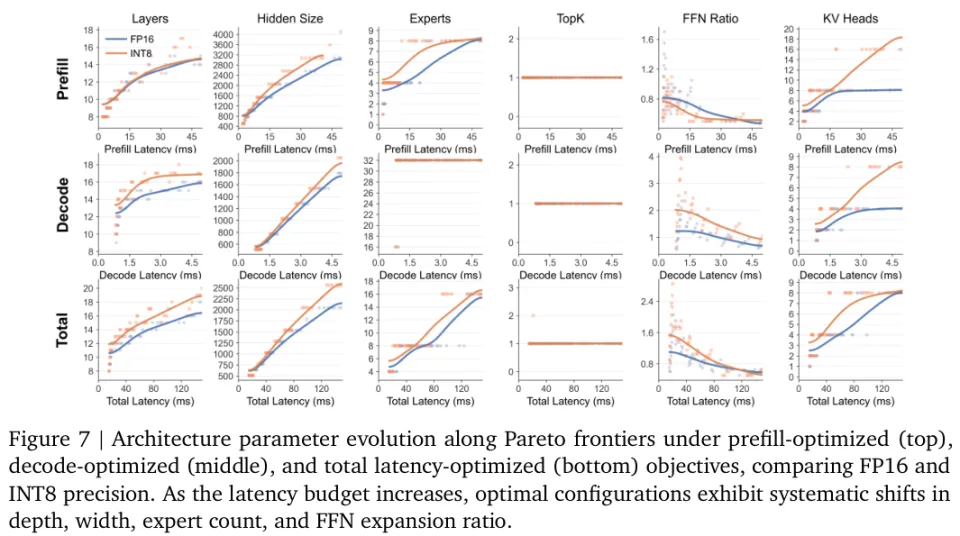 图7详细记录了随延迟预算逐渐充裕时,层数、宽度、专家数量以及前馈网络扩张率的动态变化过程。混合专家系统(MoE)以碾压的姿态霸占了所有榜单,证明了稀疏架构在端侧单样本推理场景下的绝对统治力。