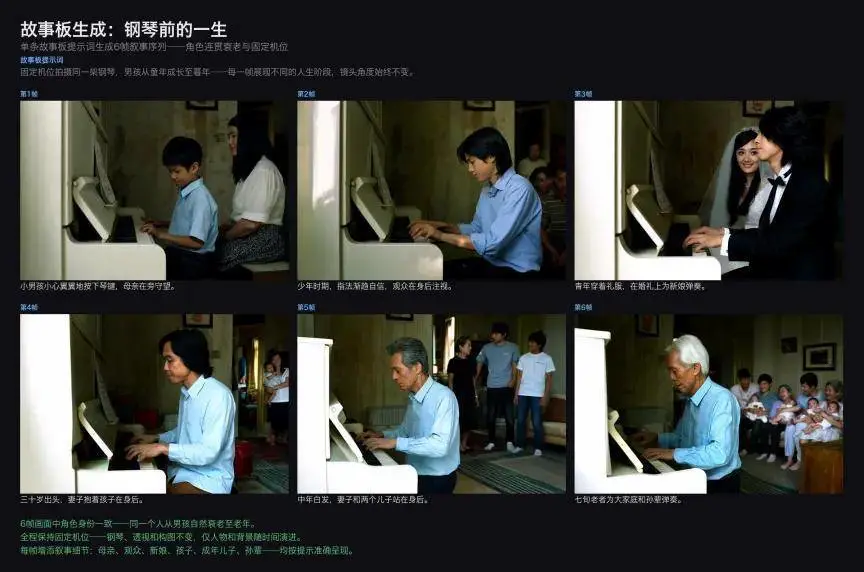 Prompt:生成 6 帧故事板,展示同一角色从童年到老年在钢琴前的一生。