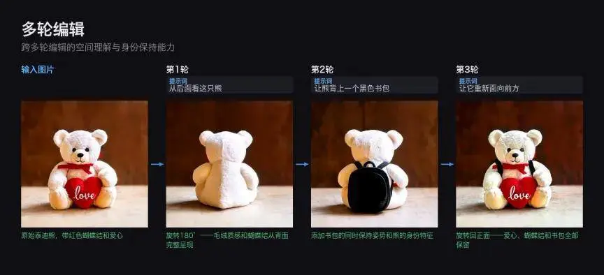 Prompt:对一张泰迪熊照片进行连续三轮编辑 —— 第 1 轮「去掉面前这只熊」,第 2 轮 「背景上加一个黑色布帘」,第 3 轮「让它变成黑白照片的风格」。