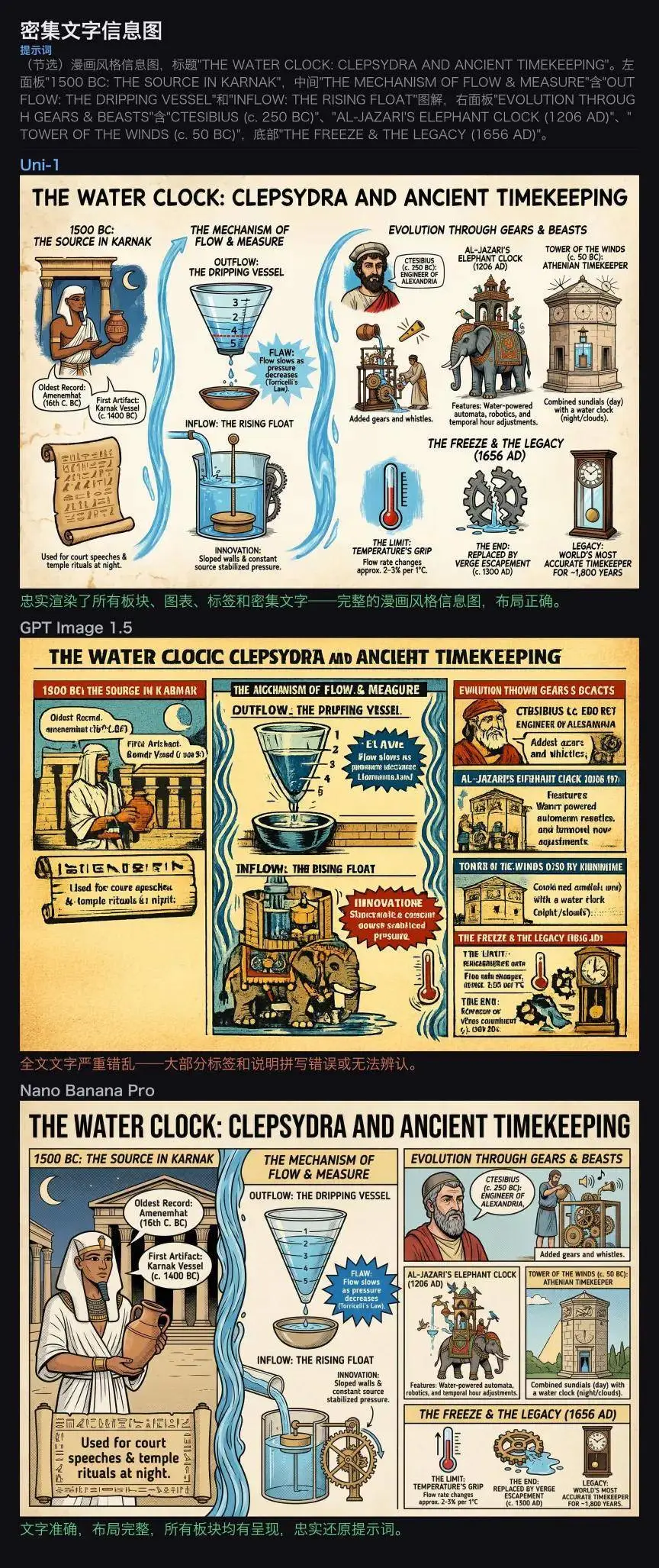 该任务要求模型在单张图像中同时处理大量文字、图表和插图元素。Uni-1 在布局规划、文字清晰度和图文配合方面的表现优于其他模型。其生成的信息图在多个知识板块之间保持了视觉层级和逻辑连贯性。