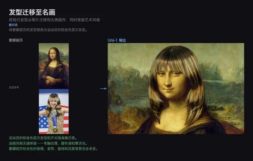 该任务要求模型精确区分「需要迁移的元素」(发型的形态和色彩)和「需要保留的元素」(达・芬奇的晕涂法画风、背景、衣着、面部神态)。Uni-1 在两个维度上均表现出良好的控制力,生成结果在风格一致性和迁移准确性之间取得了平衡。