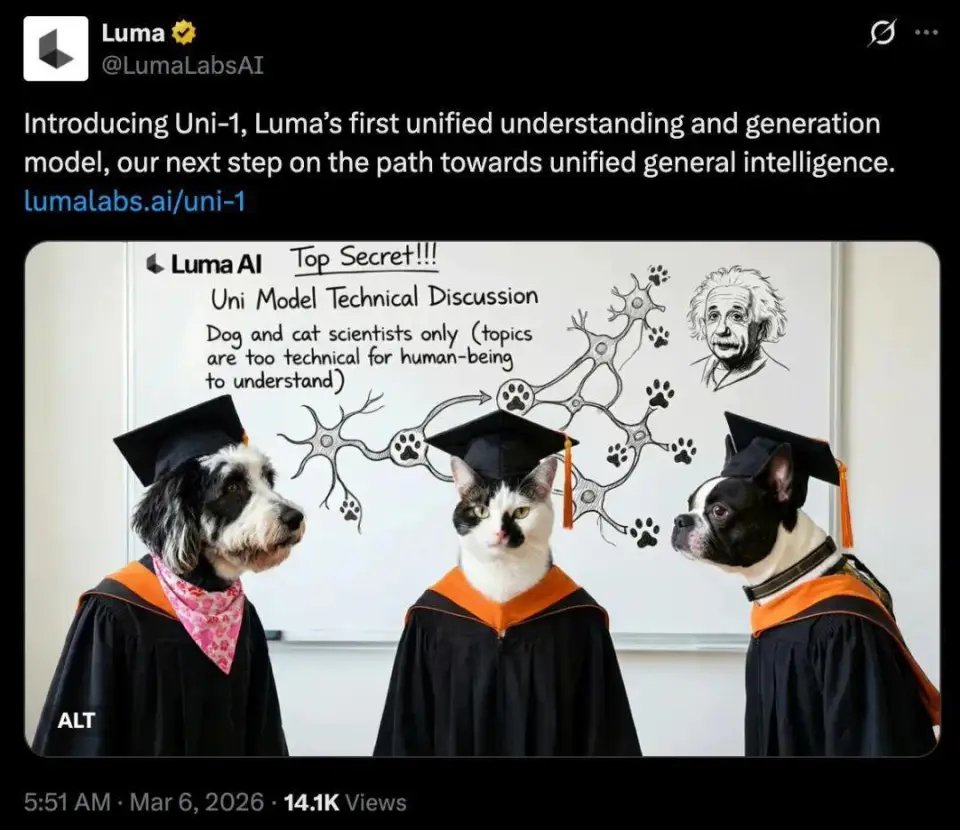 这是 Luma 首个将「理解」与「生成」统一在同一套架构里的模型,试图让 AI 不只会画,还真的会想。