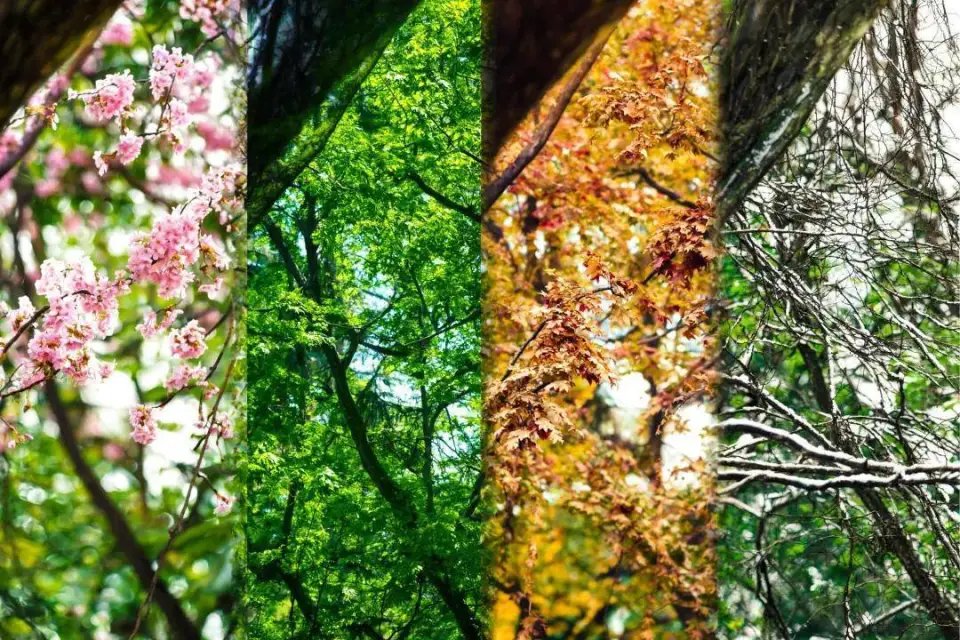 Prompt:The four seasons of a single cherry blossom tree shown simultaneously in one image, divided into four vertical strips left to right: spring with pink blossoms and rain, summer with full green canopy and butterflies, autumn with red and gold leaves falling, winter with bare branches and fresh snow. Same tree, same angle, seamless transitions between seasons.