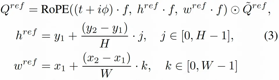 考虑到 3D-RoPE 会使时空距离更近的 tokens 在 Attention 中增强交互,作者设计了时空位置感知的 RoPE,将指定时空区域的 RoPE 重采样为更细粒度的 RoPE 分配给参考 tokens。