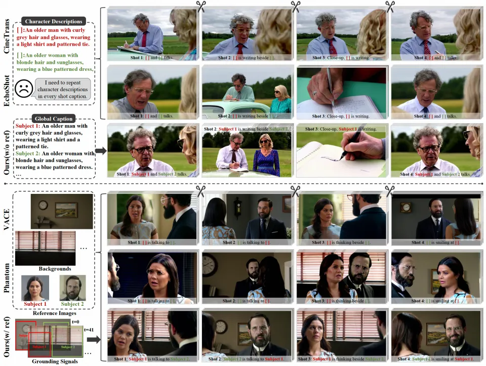 除了对比现有的 SOTA 多镜头视频生成模型之外,由于目前没有支持参考图输入的多镜头视频生成模型,作者对比了支持参考图输入的单镜头模型 Phantom、VACE,拼接它们逐个生成的镜头用于比较。