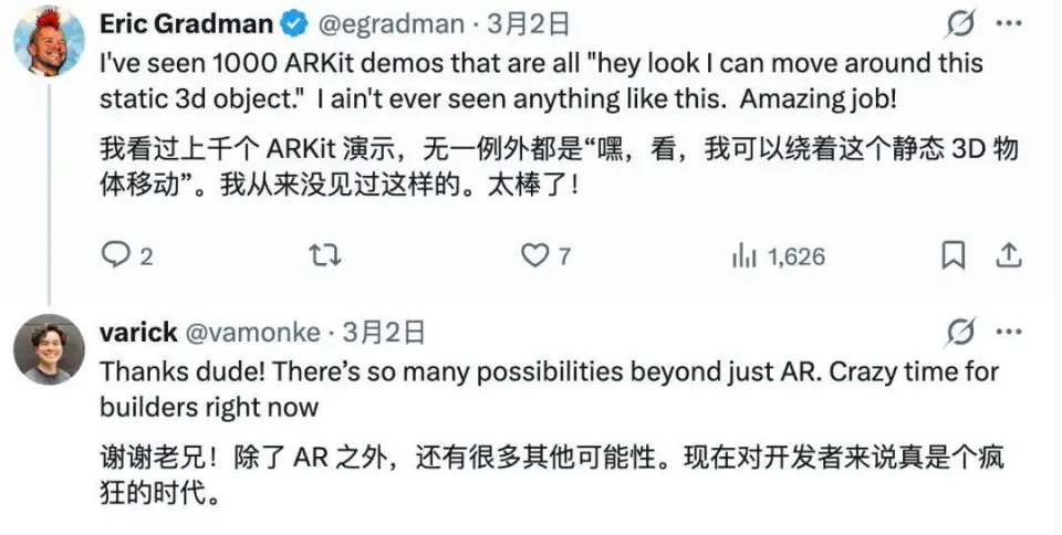 美国 AI 公司 Unlikely Labs 创始人、高级人工智能总监 Eric Gradman 评论道:“我看过上千个 ARKit 演示,无一例外都是‘嘿,看,我可以绕着这个静态 3D 物体移动’。我从来没见过这样的。太棒了!”