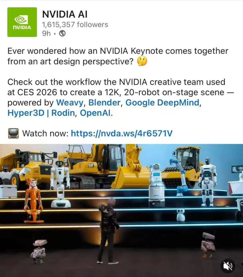 除 OpenAI 黑客松项目外,Hyper3D Rodin 也出现在另一个更 “工程化” 的高规格场景里:在今年 CES 大会上,英伟达创始人黄仁勋主题演讲的 keynote 制作工作流被公开讨论,其中提到了包含 Hyper3D Rodin 在内的工具链路线索。