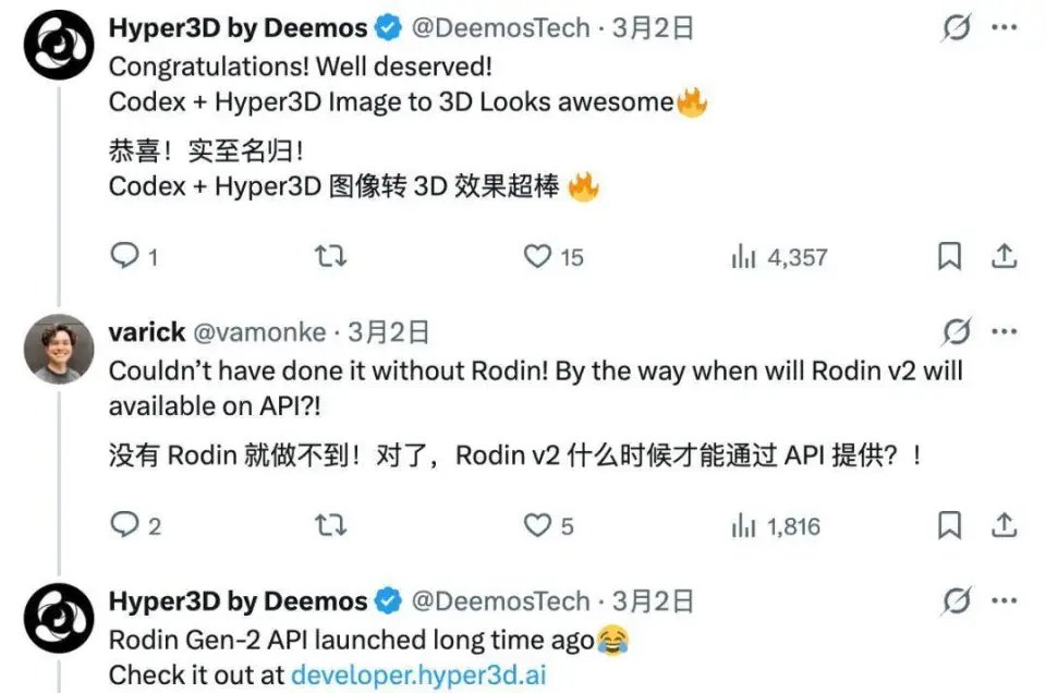 Varick Lim 在 X 上兴奋地表示:(StoryWorld)没有 Rodin 就无法实现!他的这个项目也启发了更多顶级 AI builder 跟随。3D 生成技术正在从单纯的内容展示工具,转变为开发者构建产品时的底层技术组件。