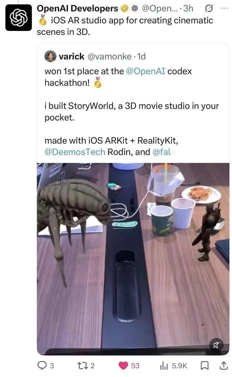 该项目获得了 OpenAI Codex Hackathon 冠军,OpenAI 官方 OpenAI Developers 也在 X 平台转发推荐了这款创建 3D 场景的应用。据开发者 Varick Lim 介绍,他在 24 小时的开发时间内完成了这款应用,其中核心的 3D 资产生成环节使用了 DeemosTech(影眸科技)的 Hyper3D Rodin 。