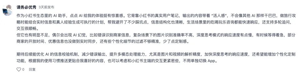 【小 A 推荐】点点 AI 是嵌在小红书里的生活小助手,形态有点像微博评论区里的“罗伯特”——常驻评论区,随叫随到。经常刷小红书的人,基本都在各大评论区见过它的身影。技术上,它接入的是 DeepSeek-R1 开源模型,同时结合小红书海量 UGC 笔记内容作为语料背景。你在刷种草笔记的时候,看到一篇烧脑长文,甚至是一个抽象梗图,都可以在评论区顺手艾特点点。当然,如果你不想在评论区互动,也可以单独打开界面和它对话。