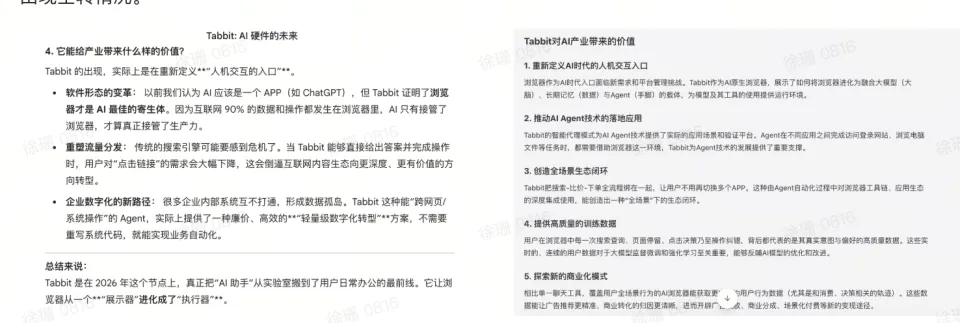 在明确需求之后,Tabbit 借助深度网络搜索,获取多源信息,并将其信息整合归类,再结构化输出。其实从执行路径上来看,似乎和传统 ChatGPT 方式并无太大差异。两份答案的信息密度相近,主要区别在于时效性,Tabbit 可以借助的实时网络搜索,获取最新信息。