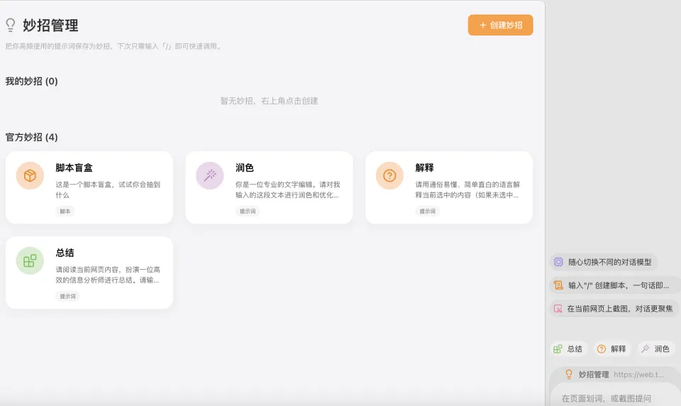 其次,当你在对话框提问的时候,还可以打开妙招管理功能中预制的 Skills 库,用户可以随时提问、解释和总结。