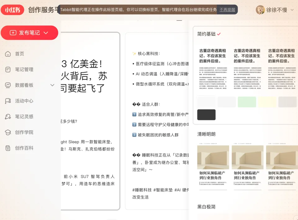 随后,我们强调内容已经上传后,浏览器自动跳至小红书页面登录,然后让用户扫码登录。完成扫码登录之后,它又开始继续执行相关指令,我们可以看到 Tabbit 智能代理是如何一步步操作的,如何调用浏览器鼠标点击什么页面,随着进入发布笔记页面后,AI 自动将标题、内容填入其中然后开始排版,并且设计多种风格。每一个指令的运转都清晰可见,用户可随时停止运转。最后,整个内容顺利一键发布成功,全程除了登录扫码,没有任何人为干预。