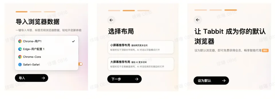 如何让习惯成自然的用户,自愿放弃用了几十年的浏览器?Tabbit 显然把「开始」环节的第一步想得很清楚:零迁移成本。