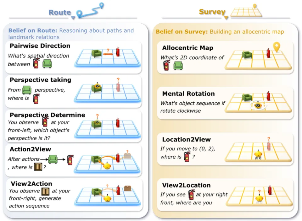 高阶推演(Exploit): 建好地图不是终点,关键在于能否经受住应用层面的极致考验。研究团队精心设计了 9 大核心空间推理任务,既有考察第一人称代入感的 “路线级推理(Route-level)”(如视角转换、根据连续动作推演最终视野),也有高度抽象的 “全局级推理(Survey-level)”(如挑战脑海里的 360 度动态心智旋转、构建上帝视角的绝对坐标构图)。