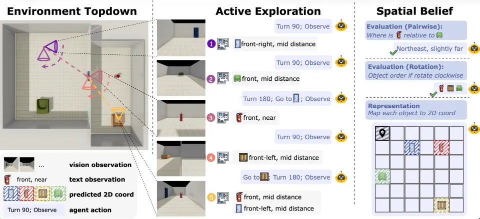 Theory of Space:主动探索,信念探测以及任务评估。左侧展示智能体在多房间局部观测下的轨迹俯视图;中间呈现其在文本或视觉环境中的 “移动 - 旋转 - 观测” 闭环,通过第一人称观测实时更新内部信念;右侧则通过空间任务及认知地图探测,对信念的利用与表征进行深度评估。