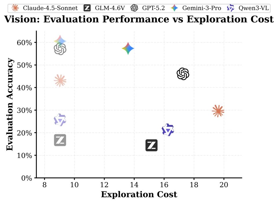 研究团队将 GPT-5.2, Gemini-3 Pro, Claude-4.5 Sonnet, GLM-4.6V, Qwen3-VL 等主流大模型送入考场。结果令人震撼:当 AI 面临 “自主求解不确定性” 的任务时,看似强大的它们集体迷失,暴露出令人担忧的四大深层病理。
