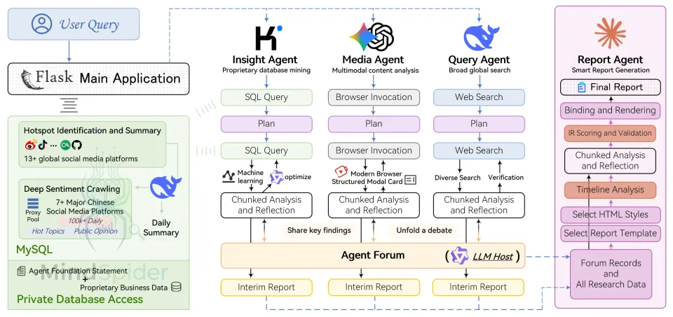 技术上,它结合了自动化数据抓取、大模型分析、自动报告生成,最终能输出一份数十页的舆情分析文档。