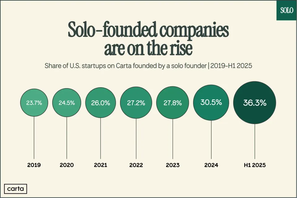 Carta的量化数据表明:如今36.3%的新公司,都是solo founder创立的。