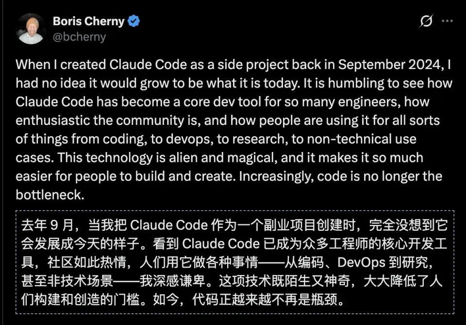 类似的例子,还有Anthropic的Claude Code之父Boris Cherny。要知道,Claude Code完全是他的一个副业项目!