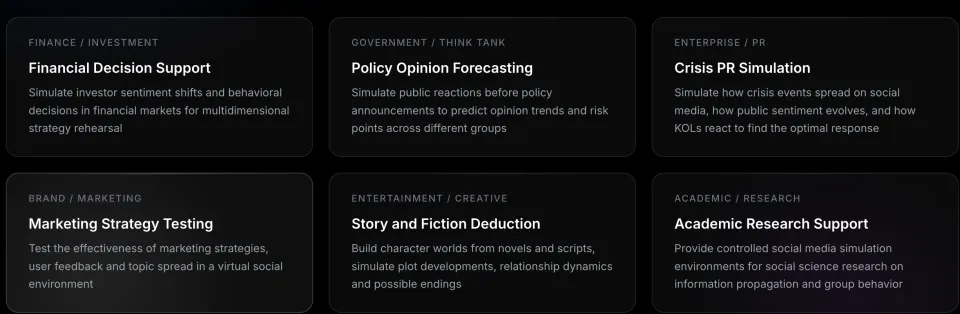 MiroFish的目标应用场景:金融决策支持、政策舆论预测、公关危机模拟、营销策略测试、故事与虚构推演、学术研究支持