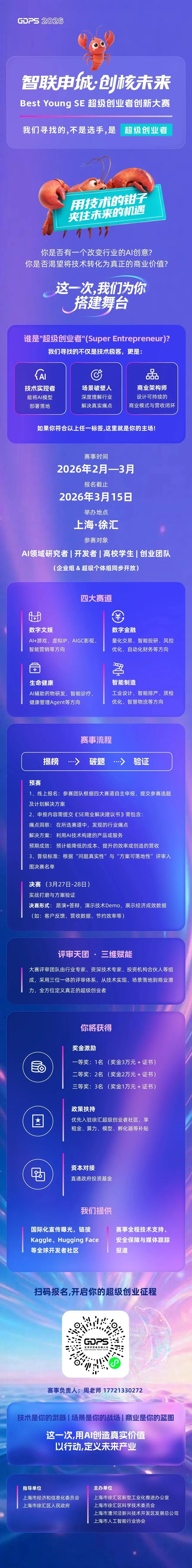 新智元 发布于 6小时前 OpenClaw燃爆魔都!6370亿赛道遇上龙虾局,来现场剥虾写代码 新智元报道 编辑:YHluck【新智元导读】2026年3月27日-29日,上海徐汇西岸国际会展中心。一场专为AI创业者打造的顶级赛事正式启动。融合爆火OpenClaw龙虾热,寻找AI极客。千亿产业红利加持,带你玩转Agent极致落地,用技术的钳子夹住未来机遇,实现极致变现!在2026年的今天,「超级个体」早已不是痴人说梦,而是正在发生的颠覆!随着Agent智能体的爆发,「个体」加上AI,就能包揽代码、设计、运营与变现。这群被称为「SE超级创业者」们,正依托OPC模式重构全新的生产关系。而即将到来的全球开发者先锋大会同期举办的SE超级创业者创新大赛,就是为你量身定制——在这里,你的一个极致Idea,就能撬动无限的商业可能。别以为AI大会只有枯燥的黑屋子和PPT!近期火爆科技圈的「OpenClaw龙虾热」,直接把极客的狂欢搬到了黄浦江畔。你左手敲击着改变世界的代码,右手和顶级资本、技术大牛碰杯畅谈。在这个只讲求「极致应用、极致效率、极致落地」的AI原生时代,写代码不仅是信仰,更是未来的机遇。就像海报上那句极度出圈的宣言——「用技术的钳子,夹住未来的机遇」!超6370亿的AI产业规模、149款生成式大模型备案,这不仅是一场「1+3+50+100+N」的技术派对,更是一条从技术赋能到场景落地的最快变现通道。数字文娱、数字金融、生命健康、智能制造四大赛道直击当下最烫手的创业命题。更关键的是:你的对手和队友,可能是下一个独角兽的创始人。高额现金奖励、顶级孵化资源、一线资本对接已全部就位。3月27日,全球开发者先锋大会,只要你敢带着极致应用来,你就是下一个超级偶像! AI资讯 浏览 (5) 点赞 收藏