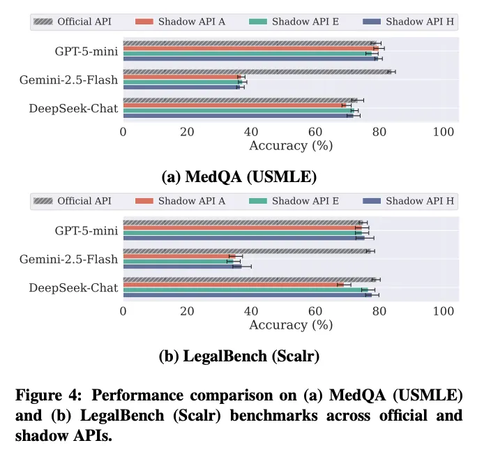 论文在医学基准MedQA上测试了官方API和Shadow API之间的差异。Gemini-2.5-flash在官方API上的准确率是83.82%。
