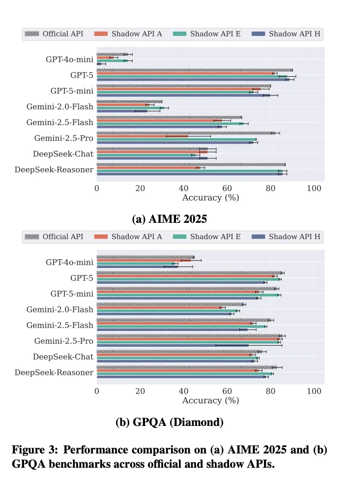 在考察大模型复杂推理能力的 AIME 2025(竞赛级数学基准测试)中,黑产 API 的表现属实差爆了。论文发现,当使用 Shadow API A 时,原本强大的 Gemini-2.5-pro 准确率直接暴跌了 40.00%,而主打推理的 DeepSeek-Reasoner 准确率也暴降了 38.89% 。