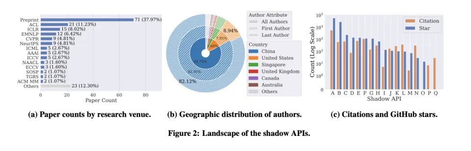 经过调查,作者发现17个shadow APIs被用于187篇学术论文中。其中,有116篇(占比62.03%)已被ACL、CVPR和ICLR等顶级同行评审会议或期刊接收。