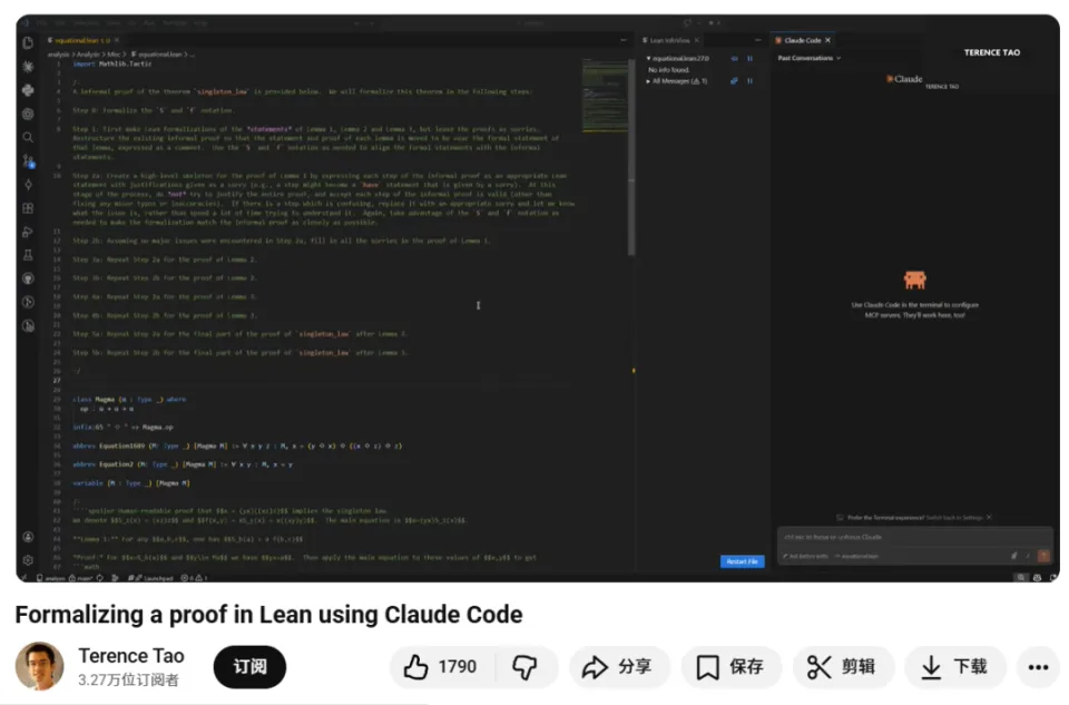 近日,菲尔兹奖得主、加州大学洛杉矶分校(UCLA)数学系教授陶哲轩(Terence Tao)在 YouTube 发布了一段时长约 26 分钟的实操视频,详细演示了如何利用 Anthropic 推出的 Claude Code 代理工具,在 Lean 定理证明器中完成一项数学证明的形式化全过程。