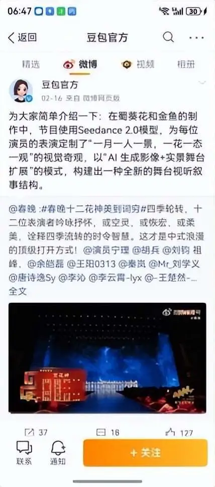 曾经需要下载专门APP、访问网页、输入复杂指令prompt才能使用的AI视频工具,在抖音、剪映等国民级应用中,实现了“拍同款”式的傻瓜操作。春节期间,个性化的AI拜年视频,成了潮流人士新年祝福的新方式。马年春晚,则是AI视频破圈的最高潮,字节跳动的Seedance 2.0模型参与《贺花神》等舞台视觉,让亿万观众直观感受到了中国AI视频生成的效果。