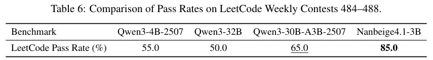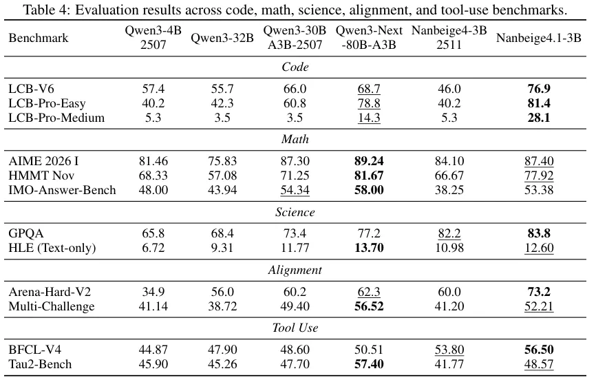 Nanbeie4-1-3B明显优于类似规模的先前模型,甚至比肩更大的模型(如Qwen3-Next -80B-A3B)。