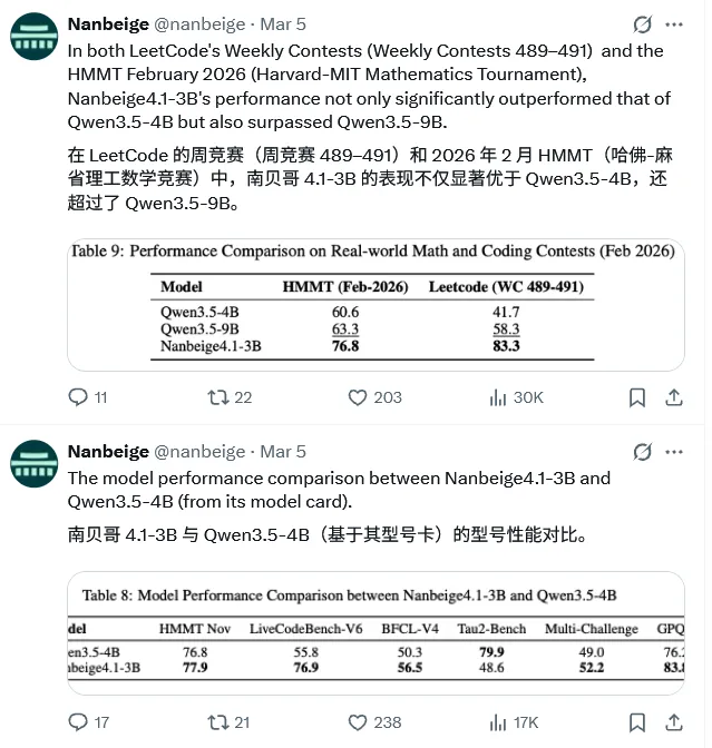 团队在最新的测试结果中显示,Nanbeige4.1-3B(纯文本)甚至超越了刚刚发布的Qwen3.5-4B(多模态)和Qwen3.5-9B(多模态)。