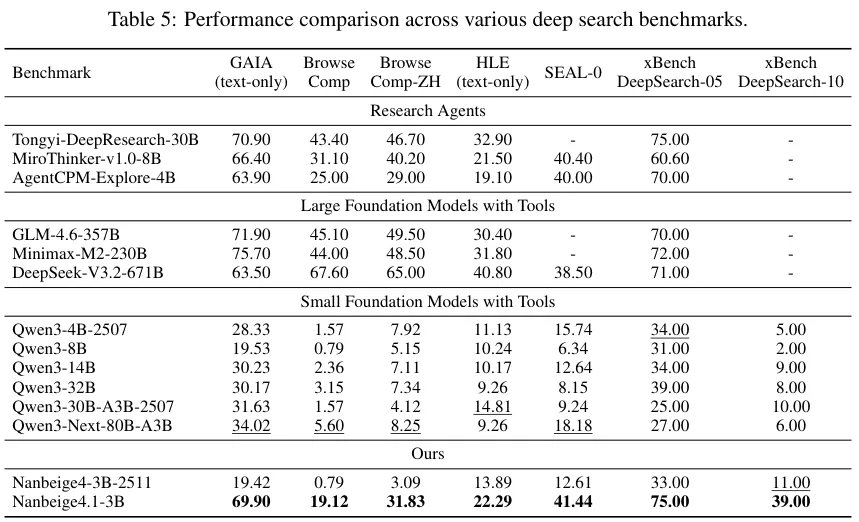 Nanbeige4.1-3B仅仅使用30亿个参数的轻量级大脑,惊人地完成了高达600轮的超长周期网络搜索与复杂工具调用。