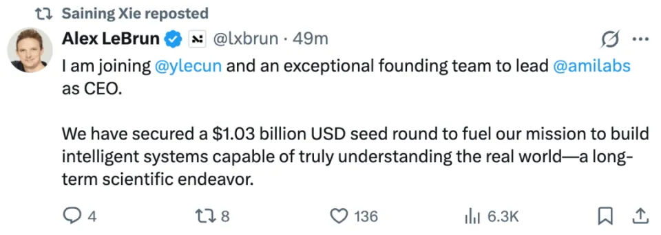 种子轮10.3亿美元!谢赛宁加入,LeCun的世界模型公司太吸金了