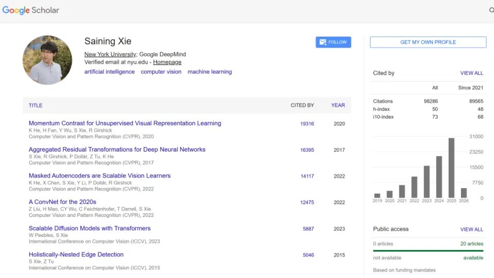 在学术的一侧,谢赛宁是纽约大学(NYU)计算机科学助理教授(目前学术休假),曾在加州大学圣地亚哥分校(UCSD)任研究助理。谢赛宁曾获得过 Marr 奖荣誉提名奖、NSF CAREER 奖、AISTATS 时间考验奖和 PAMI 青年研究员奖,当前的 Google Scholar 文献被引用次数已达 9.8 万。