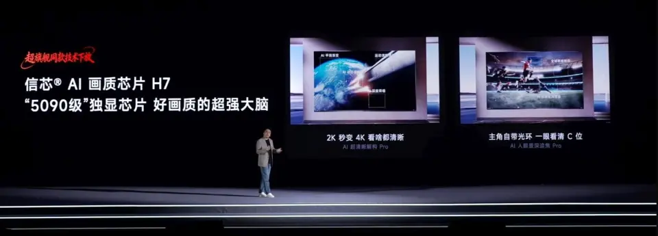 张四海称,信芯H7就是给电视装上5090级的独显芯片,其AI超清晰结构技术可以填补细节,AI人眼景深追焦Pro能识别核心人物强化主角。