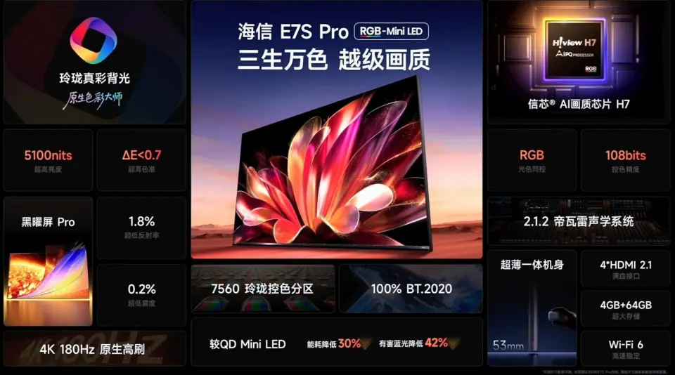 此次海信发布的E7S Pro搭载最新RGB-Mini LED架构,在画质、音质、配置、外观上都实现升级。