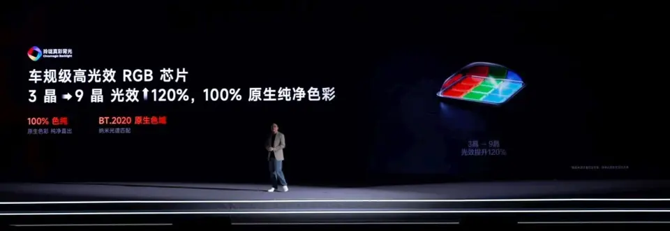 E7S Pro的底层搭载了车规级高光效RGB芯片,采用9晶架构,使得光效提升120%,实现100%的BT.2020原生色域,能还原大自然的绝大多数色彩。