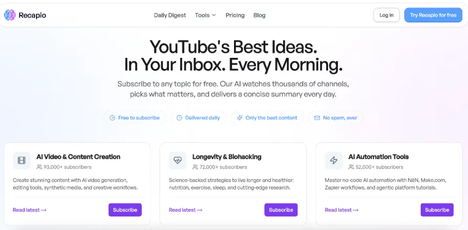 2、每日YouTube精选:自动抓取订阅YouTube频道新视频,提炼核心观点生成简报,已升级为独立产品Recapio。
