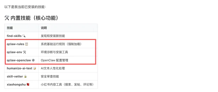 另外QClaw 的内置技能也有亮点,这些东西原版 OpenClaw 完全没有。