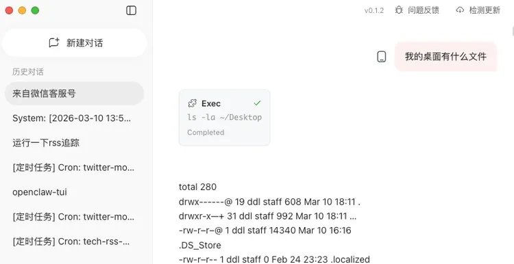 关联之后,QClaw 会把你和龙虾的对话记录同步到左侧栏。比如我测试的时候,飞书和 TUI 上跟龙虾的对话流就直接显示了出来。